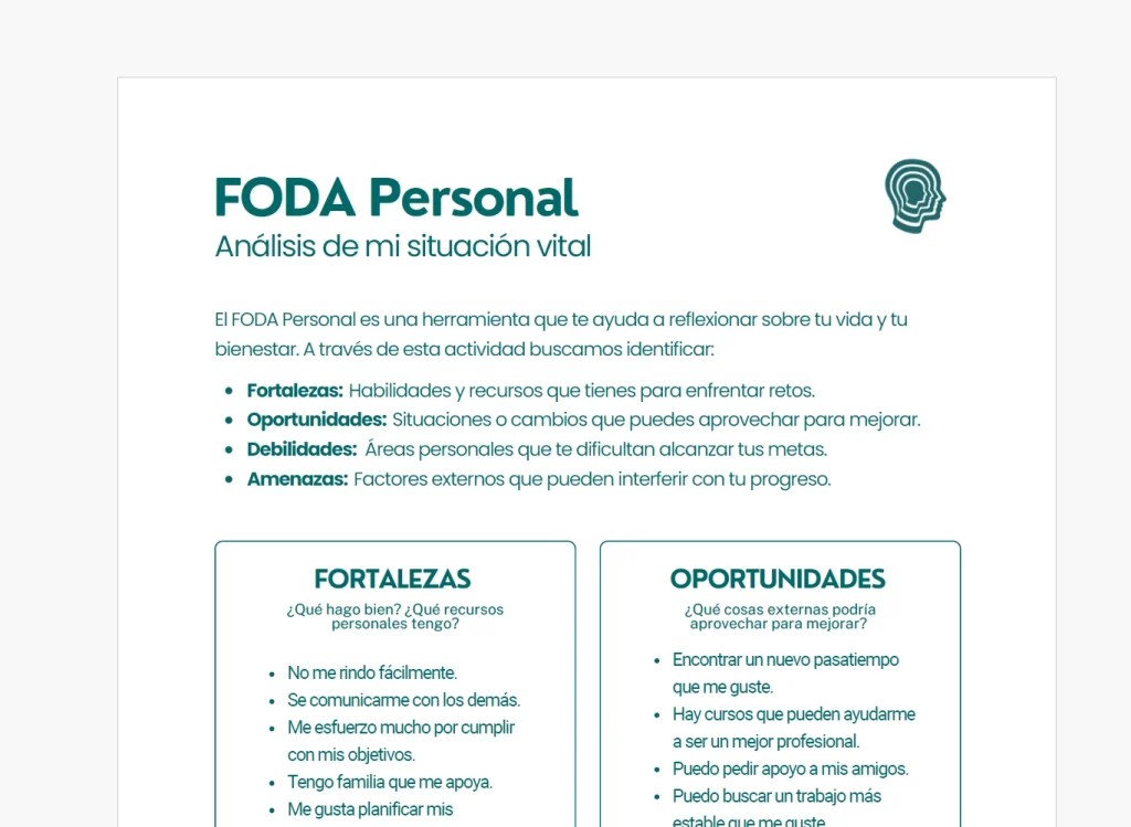 El análisis FODA Personal es una herramienta práctica que permite identificar nuestras fortalezas, debilidades, oportunidades y amenazas de forma clara y directa. Nuestro equipo clínico en la API crea esta guía sencilla en PDF para que cualquier persona pueda reflexionar sobre su situación vital y mejorar su bienestar personal y profesional (Lo usamos en terapia psicológica para ordenar ideas y aumentar la motivación.